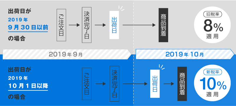 そのため、2019年9月30日以前に、ご注文を頂きお支払等を完了していただいております場合も、出荷日が10月1日以降となりますと新消費税率(10%)が適用となります。